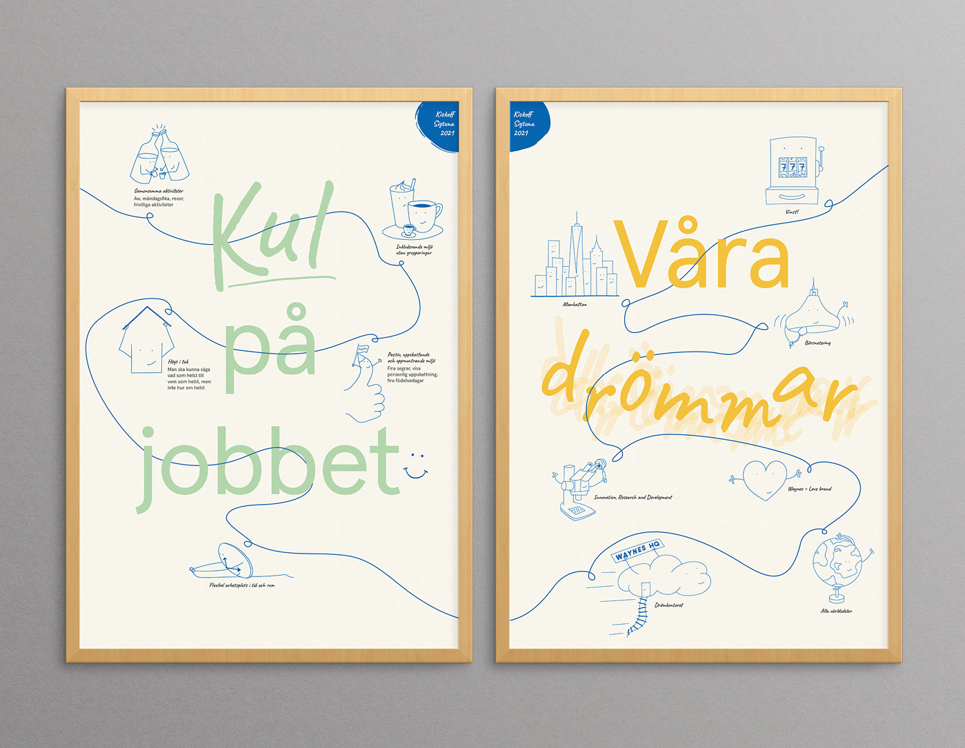 Waynes ville sammanfatta lite av det som kommit fram under personalens kickoff och göra något att hänga på väggen på huvudkontoret. Resultatet blev två posters med illustrationer som kan fungera som en påminnelse om det de kom fram till.